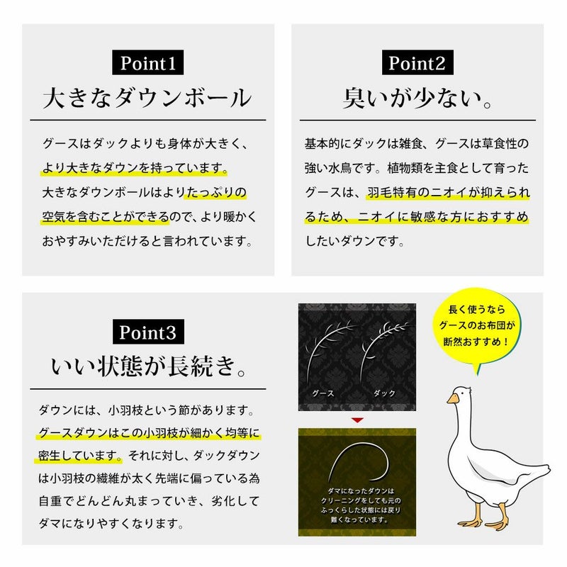 ①グースはダックよりも体が大きく、より大きなダウンを持っています。大きなダウンボールはよりたっぷりの空気を含むことができるので、より暖かくおやすみいただけると言われています。