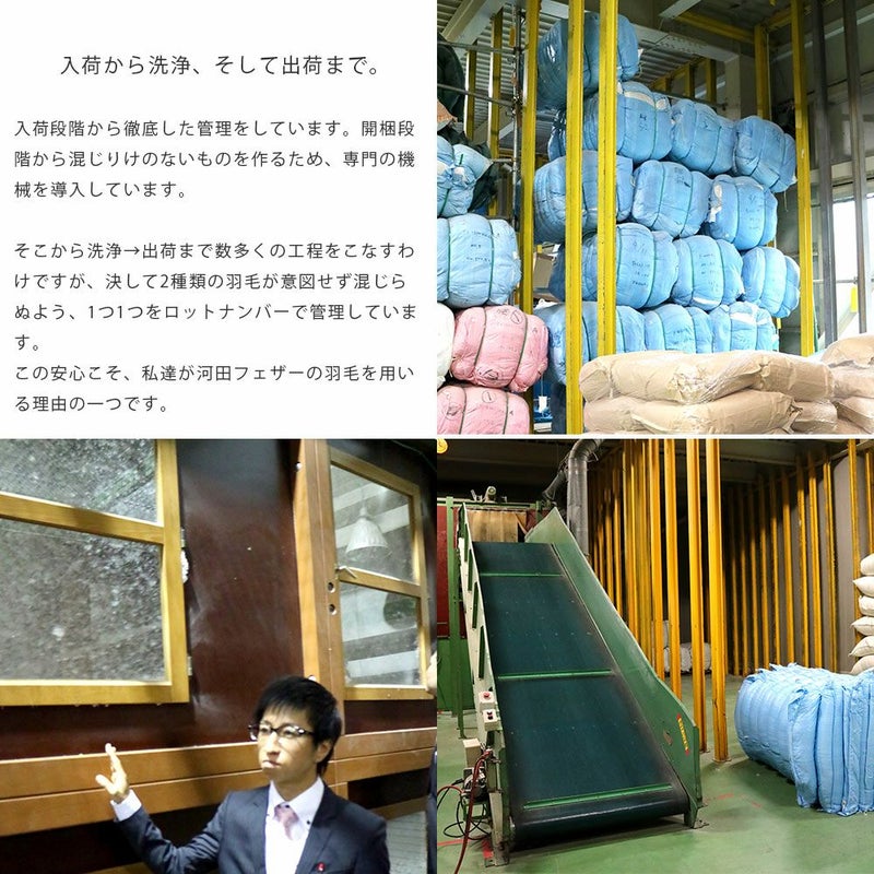 大切に育てられた原毛を長年の経験で仕入れ、ロットNo.での徹底した管理をされた河田フェザーのダウン。私たち寝具専門店は、産地を大々的に謳うのではなく、仕入れの目利きと管理・洗浄でお客様に安心を届けたいと思っています。
