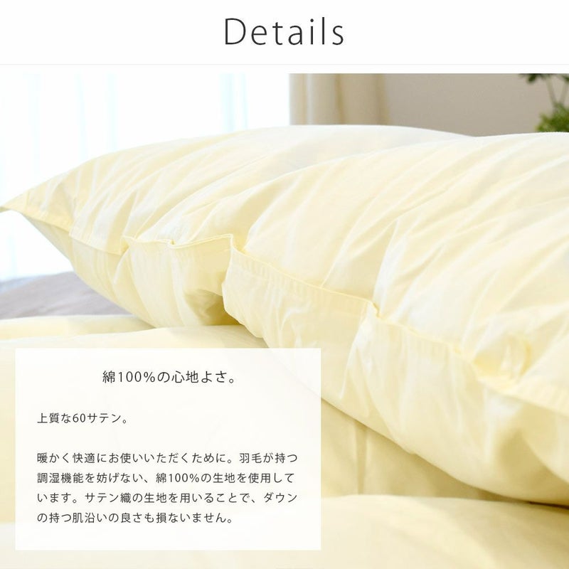 側生地は上質な60サテン。暖かく快適にお使いいただくために、羽毛が持つ調湿機能を妨げない、綿100%の生地を使用しています。サテン織の生地を用いることで、ダウンの持つ肌沿いの良さも損ないません。