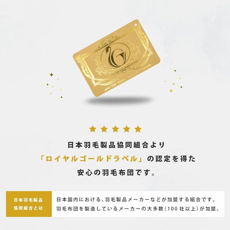 日本羽毛製品協同組合より「ロイヤルゴールドラベル」の認定を得た安心の羽毛布団です。日本羽毛製品組合とは、日本国内における羽毛製品メーカーなどが加盟する組合です。羽毛布団を製造しているメーカーの大多数(100社以上)が加盟しています。