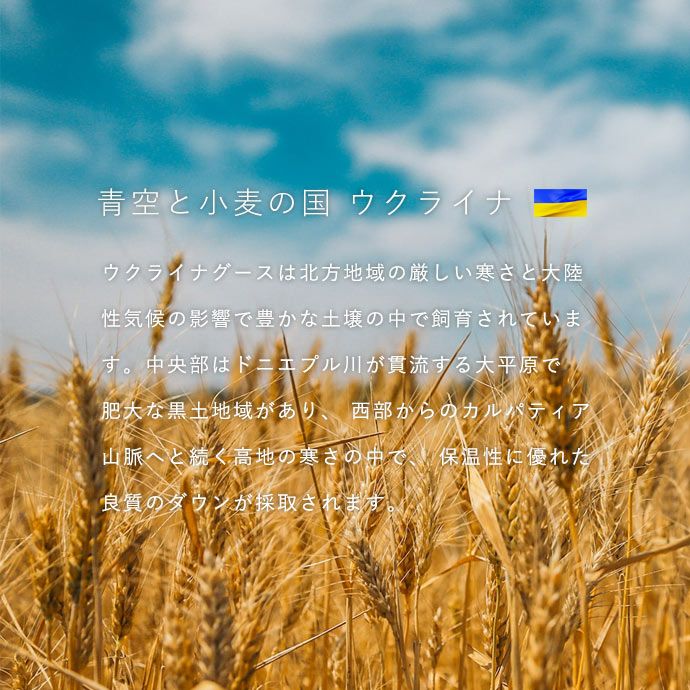 ウクライナの気候は大陸性気候で夏と冬の温度差があり、冬場ではマイナス20度~30度になります。その為、ウクライナ産シルバーグースダウンは密度があり、 良質のものとなっています。