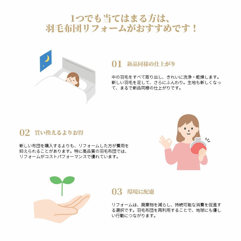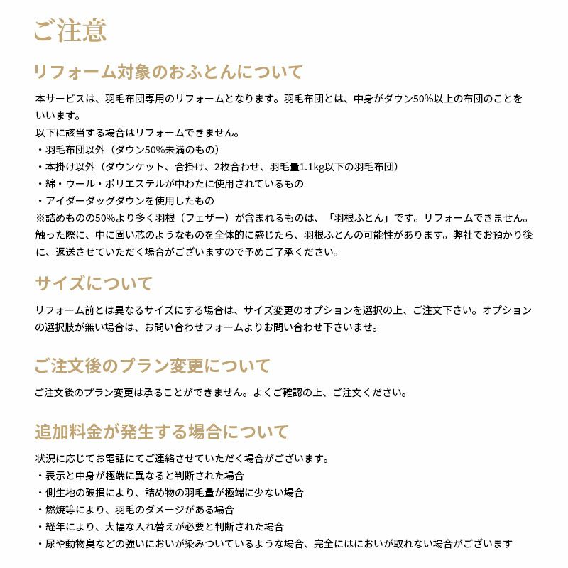 リフォーム対象のおふとんについて 本サービスは、羽毛布団専用のリフォームとなります。羽毛布団とは、中身がダウン50%以上の布団のことをいいます。