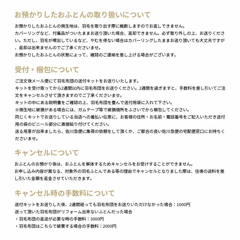 お預かりしたおふとんの取り扱いについて お預かりしたおふとんの側生地は、羽毛を取り出す際に裁断しますのでお返しできません。