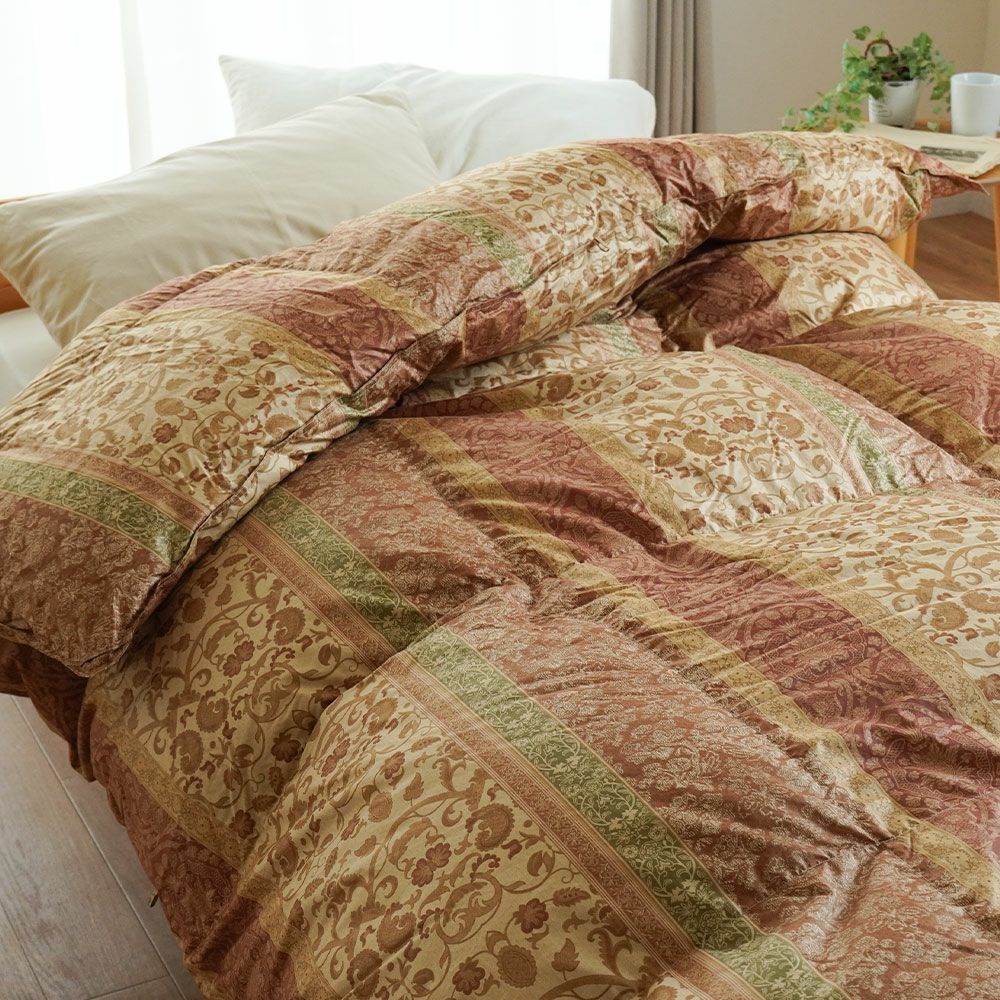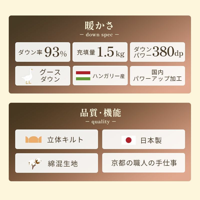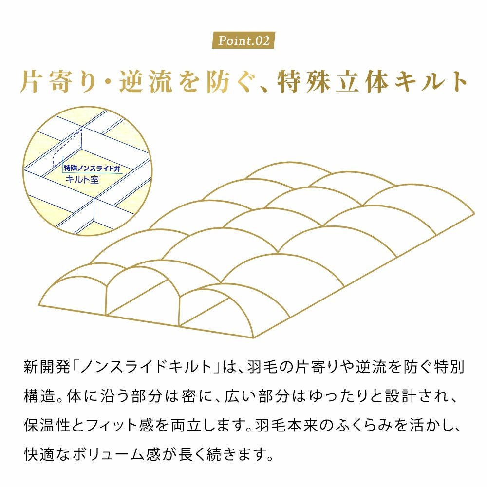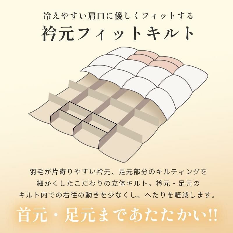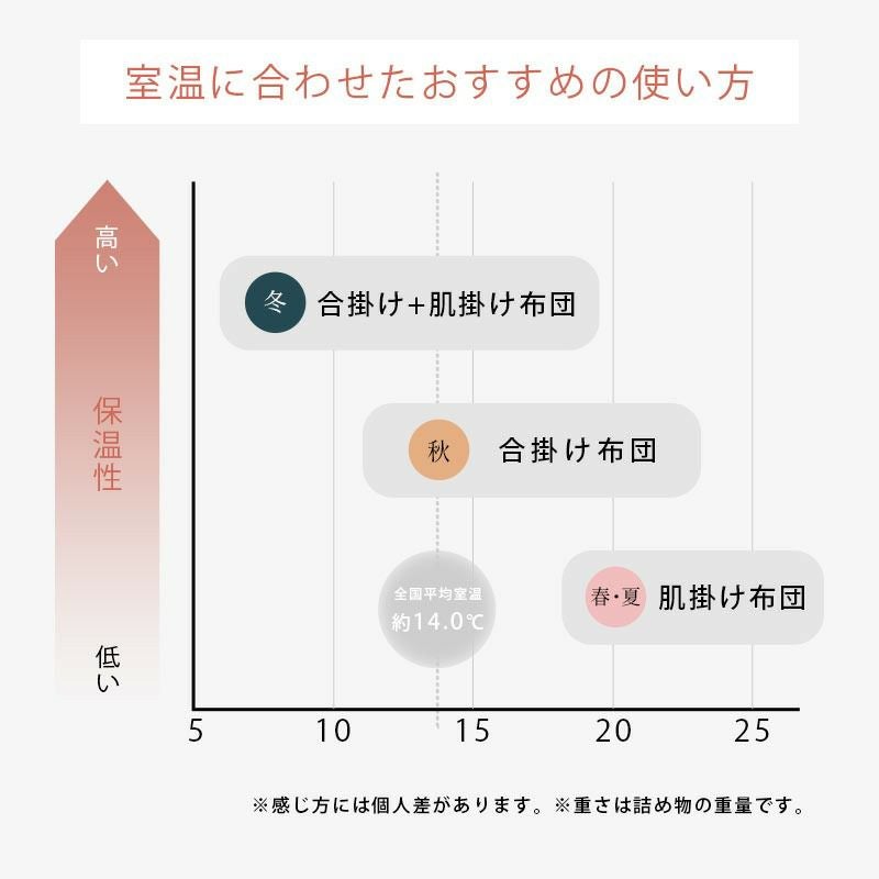 本掛けと肌掛けの間に位置する羽毛布団です。春や秋など少し冷える時期はもちろん、環境によっては冬でも十分お使いいただけます。真冬には肌掛け布団と合わせることでより温かく眠れます。長いシーズン活躍できる使い勝手の良い羽毛布団です。