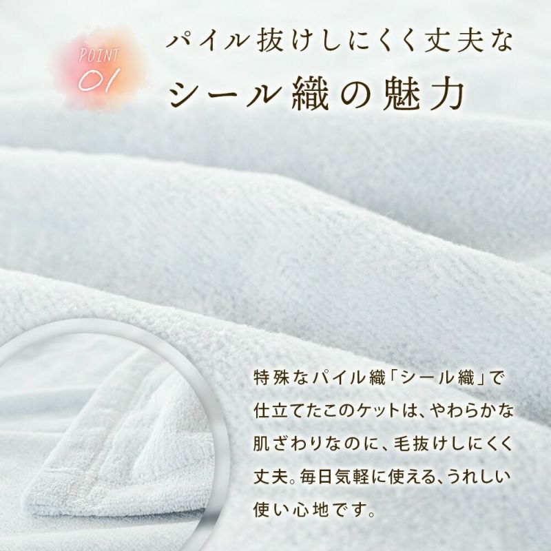 特殊なパイル織「シール織」で仕立てたこのケットは、やわらかな肌ざわりなのに、毛抜けしにくく丈夫。毎日気軽に使える、うれしい使い心地です。