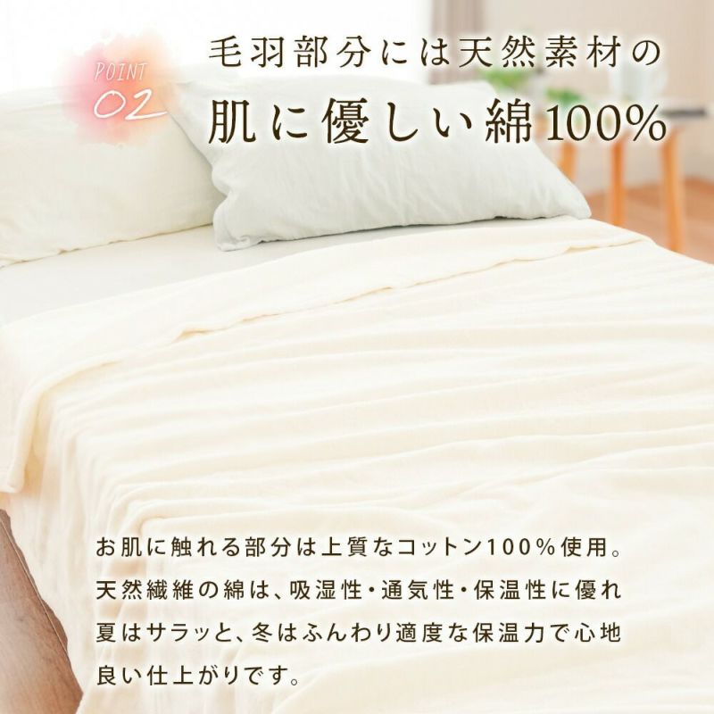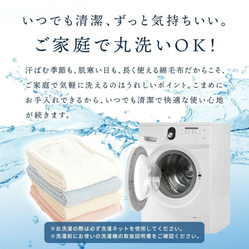 汗ばむ季節も、肌寒い日も、長く使える綿毛布だからこそ、ご家庭で気軽に洗えるのはうれしいポイント。こまめにお手入れできるから、いつでも清潔で快適な使い心地が続きます。