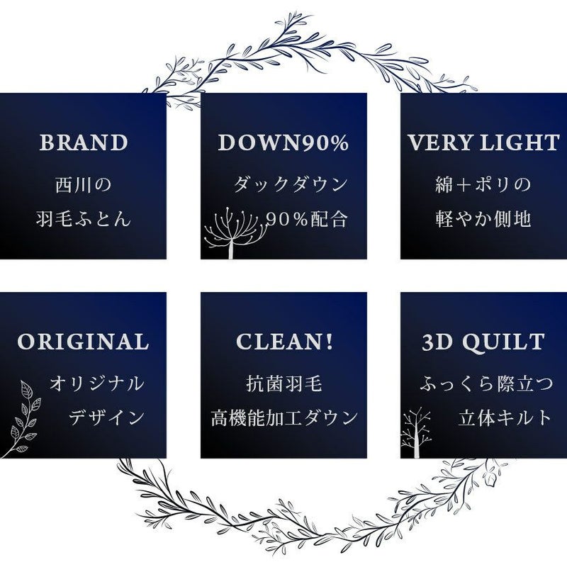 上質なダウンを90%、西川は羽毛の洗浄を徹底的に行っています。さらに、選別した羽毛に加湿乾燥と冷却除塵を施すバイオアップ加工により羽毛本来の力を引き出すことでより暖かく、軽く、クリーンな羽毛になります。さらにウイルスや菌、ニオイの成分を分散する高機能加工済み。