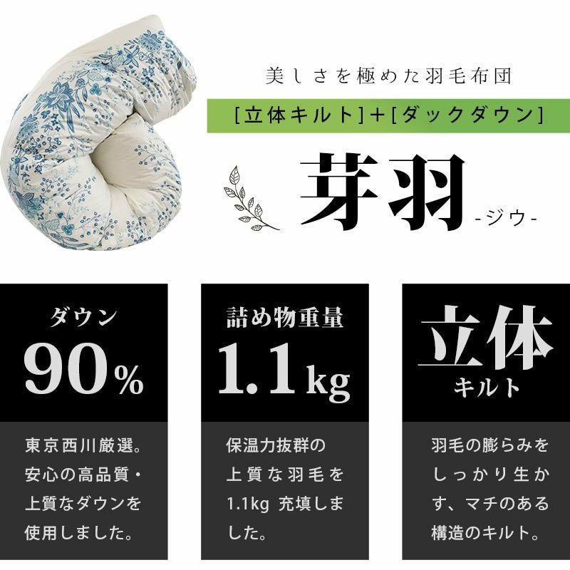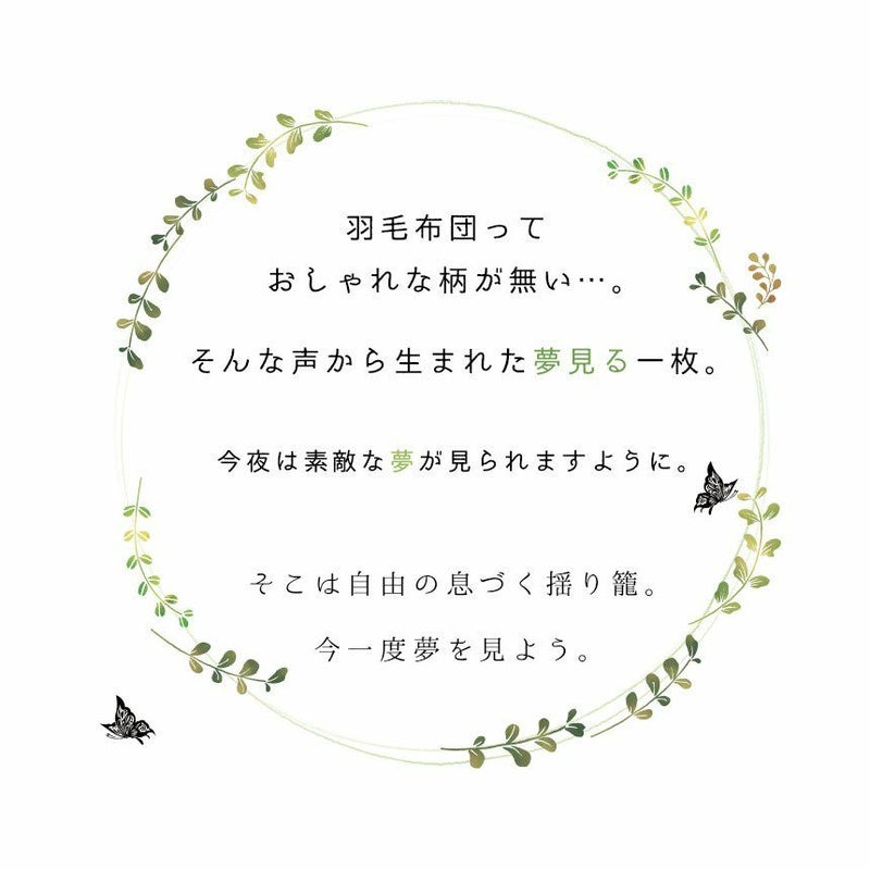 羽毛布団っておしゃれな柄がない…。そんな声から生まれた夢見る1枚。今夜は素敵な夢が見られますように。夢の芽生える羽毛布団「芽羽(じう)」