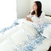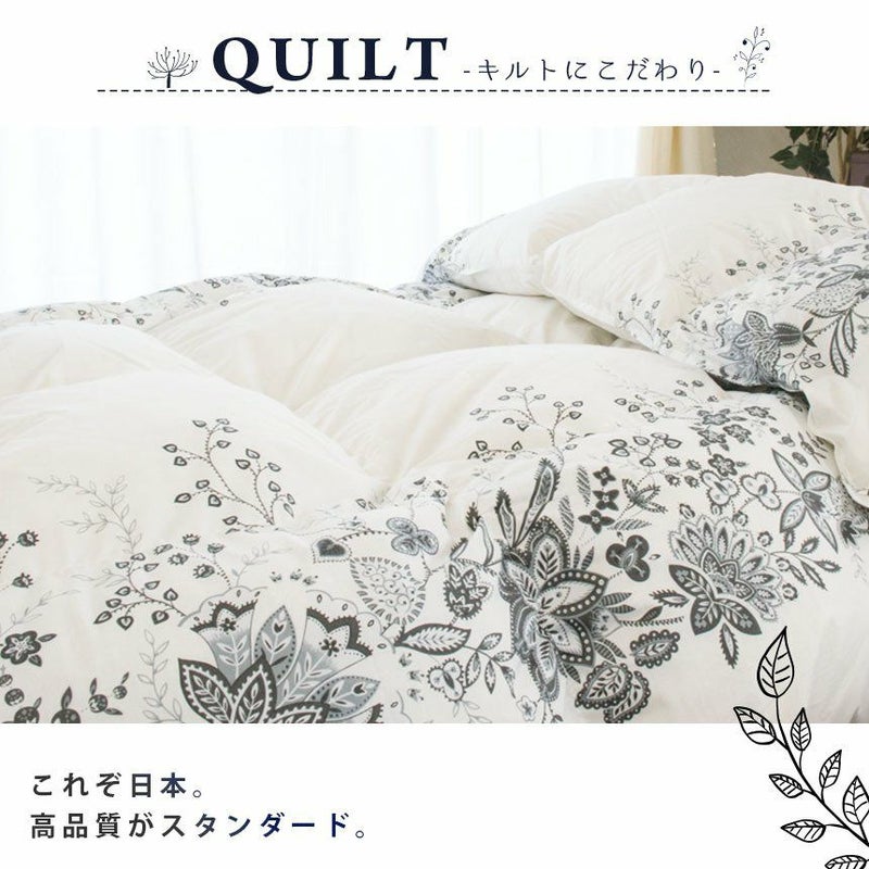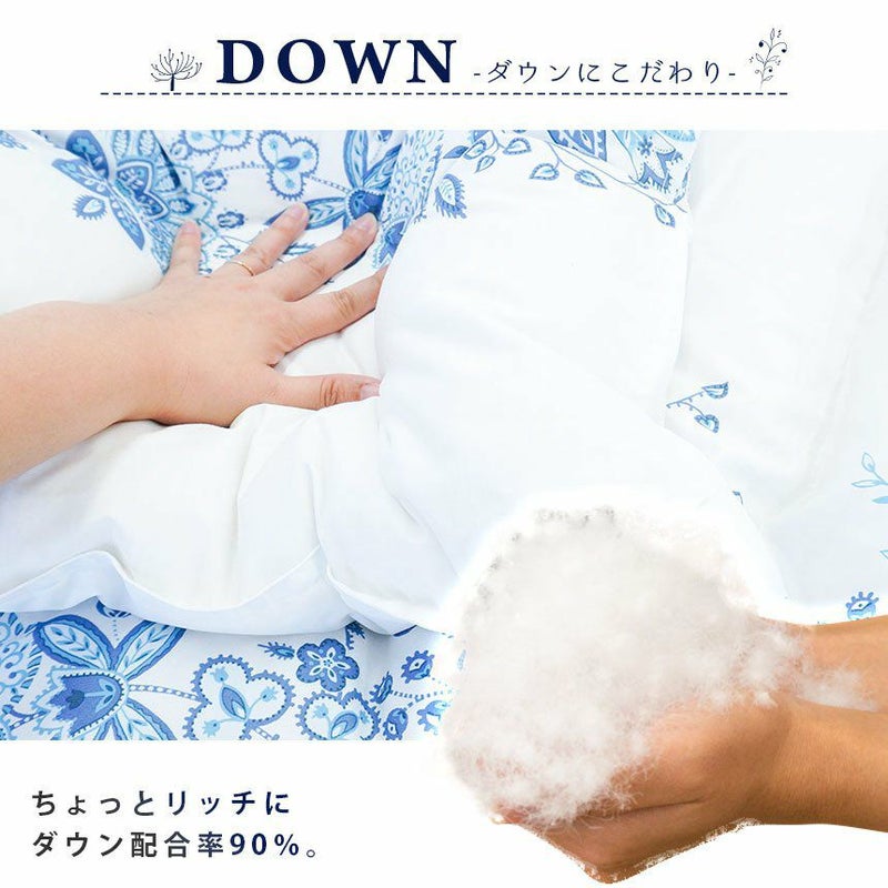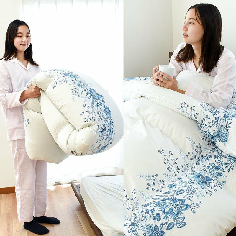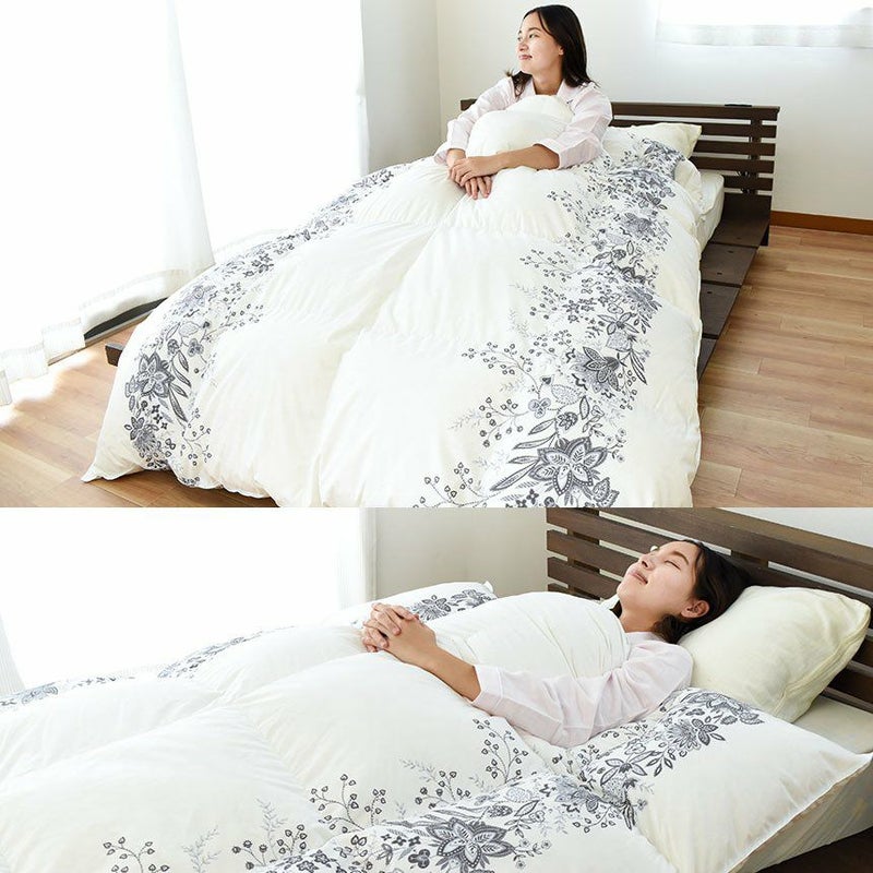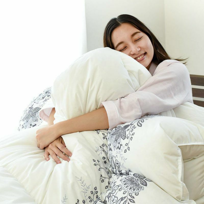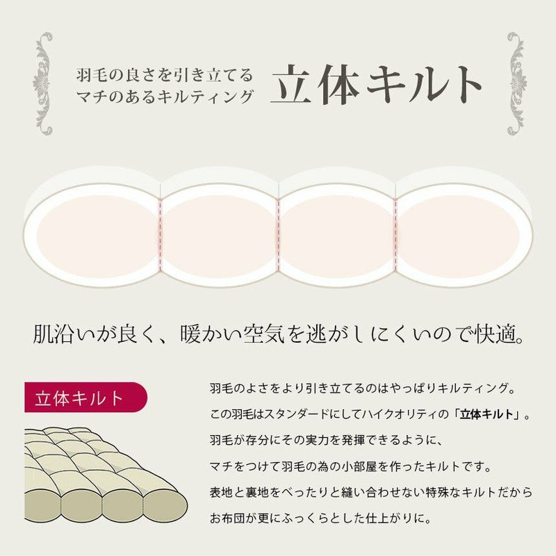 側生地は合繊にコットンを織り交ぜることにより、吸湿性・通気性を持たせました。もちろん羽毛の飛び出しを防ぐダウンプルーフ加工済み。表地と裏地をべったりと縫い合わせない「立体キルト」だから、お布団がさらにふっくら♪