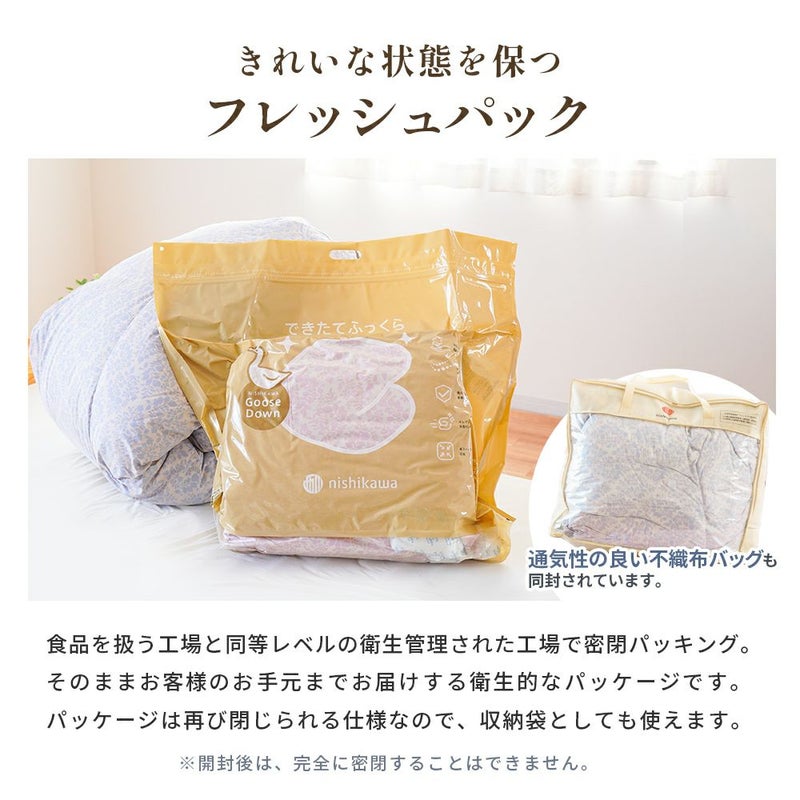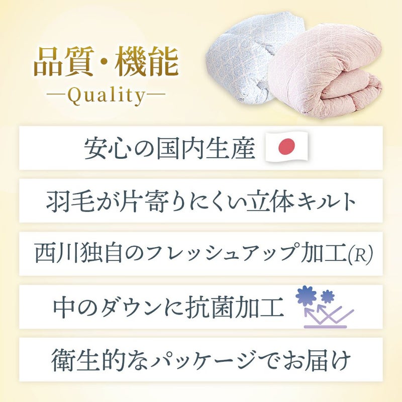 しっかり綺麗に磨かれた、西川自慢の上質なダウンをたっぷり1.2kg詰め込みました。ふんわり軽い羽毛は、たったの0.1kg違うだけで、ボリュームに差がでてきます。 より満足していただける暖かさにするため、少しお高いけれど買ってよかったと思っていただけるような品質と価格に妥協しないこだわりが詰まっています。