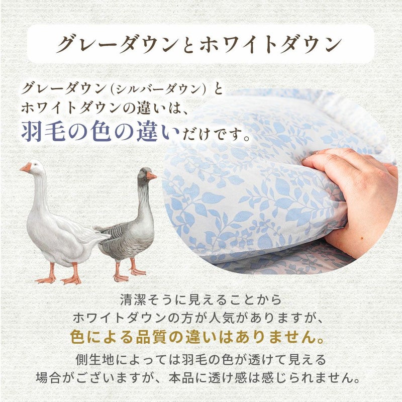 なお、グレーダウン(シルバーダウン)とホワイトダウンの違いは「羽毛の色の違いだけ」です。清潔そうに見えることからホワイトダウンの方が人気がありますが、色による品質の違いはありません。側生地によっては羽毛の色が透けて見える場合がありますが、本品に透け感は感じられません。