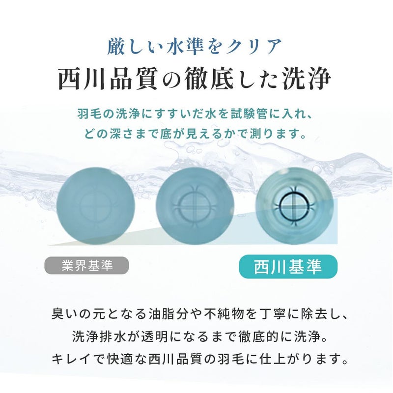 臭いの元となる油脂分や不純物を丁寧に除去し、洗浄排水を試験管に入れてどの深さまで底が見えるか測り、水が透明になるまで徹底的に洗浄。キレイで快適な西川品質の羽毛に仕上がっています。また、こちらの商品は中のダウンに抗菌加工をしているので、見えないところまで清潔にお使いいただけます。羽毛布団は洗えないから不安を感じる方にもおすすめです。