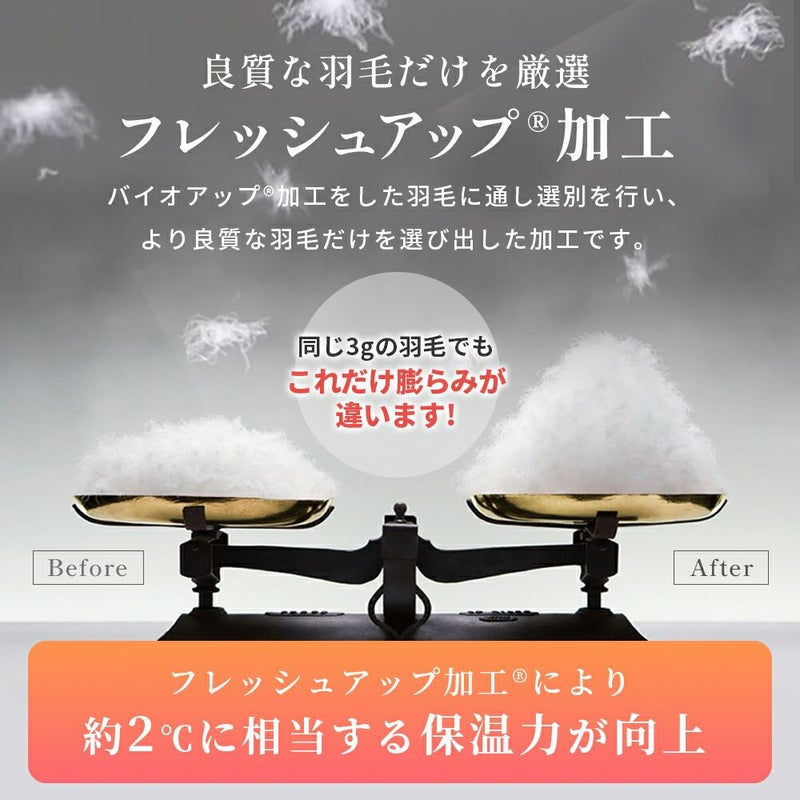 nishikawa(西川)の羽毛布団は独自のダウン加工「フレッシュアップ加工®」を施すことで、加工前の羽毛と比べて約2℃に相当する保温力が向上し、あたたかいという調査結果がでています。 羽毛本来のちからを目覚めさせる「フレッシュアップ加工®」とは、不純物を取り除き選別した羽毛に加湿乾燥、冷却と再度不純物を取り除く作業を行う「バイオアップ®加工」をした羽毛に通し選別を行い、より良質な羽毛だけを選び出した加工です。 加工前の羽毛と比べて、空気の掴む力が上がり保温力が高く、よりクリーンで上質な羽毛に仕上がります。