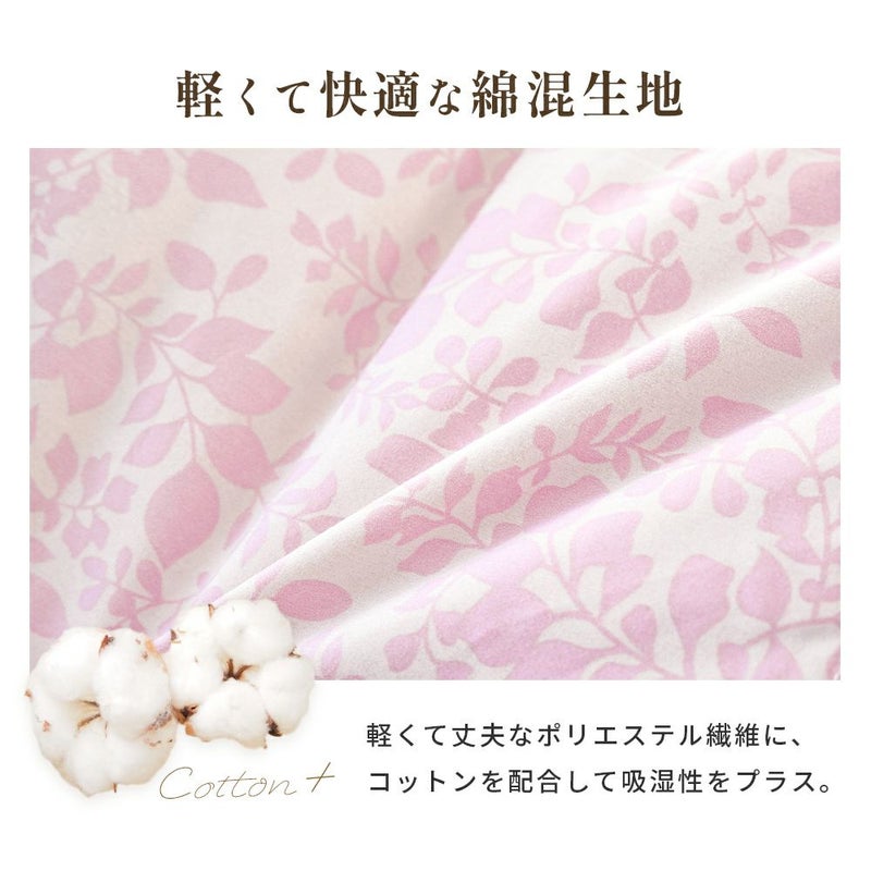 軽くて丈夫なポリエステル繊維にコットンを配合して吸湿性をプラスしています。生地が軽いので、羽毛のふくらむ力を遮らず、ふっくらとした布団に仕上がります。