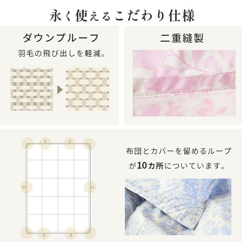 羽毛の飛び出しを軽減する「ダウンプルーフ」に加え、縫製部分も丈夫な「二重縫製」。毎日使うものだからこそ、見えない部分にもこだわった、永く使える安心の設計です。