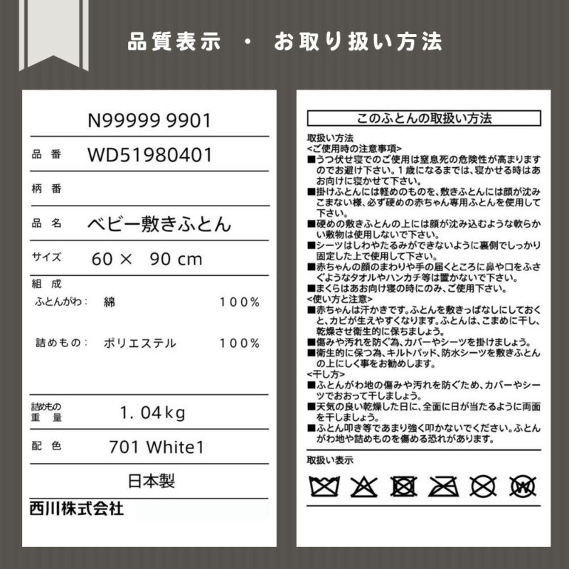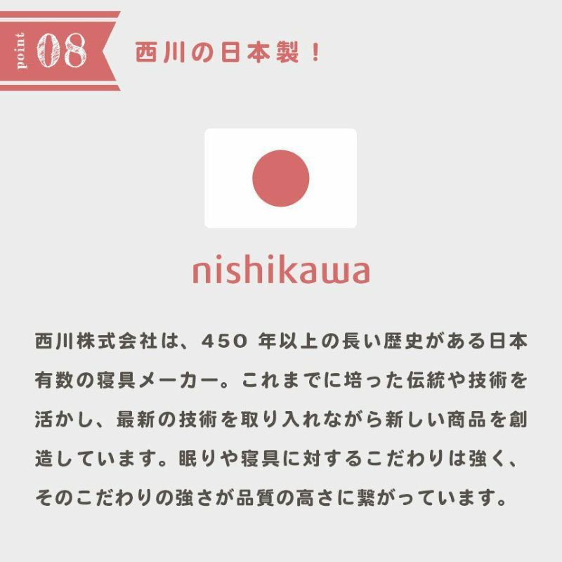 西川製・国産の安心品質なので、ご家庭用はもちろん出産祝い等プレゼントにもおすすめ。