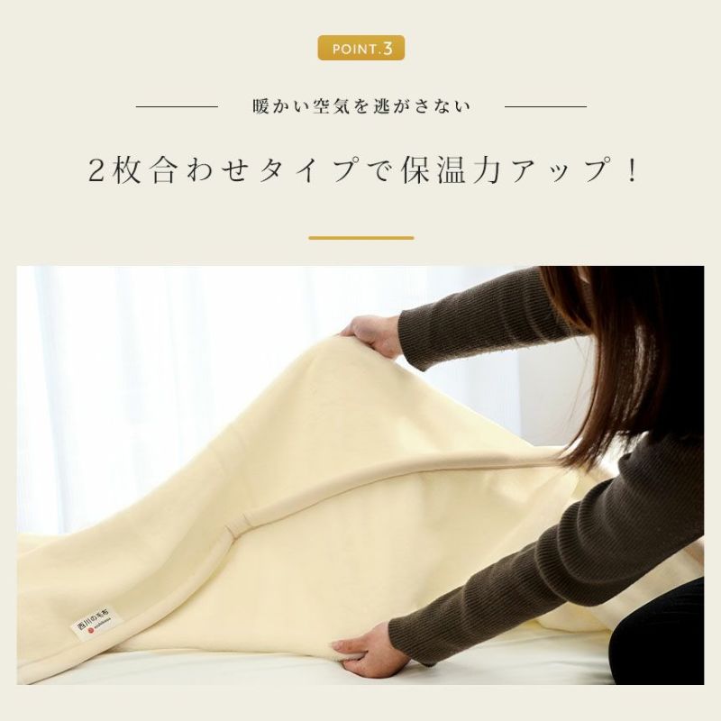 2枚の毛布をヘム加工でしっかり1枚に縫い合わせた2枚合わせタイプなので、重なった生地の間にはたっぷりの空気の層ができ、暖かさを閉じ込めて保温力アップ。 暖かい空気を逃がさない構造になっています。