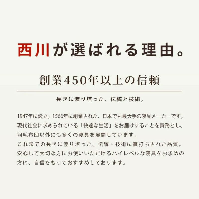 西川株式会社は、1566年創業の日本有数の寝具メーカー。450年以上の長い歴史がある老舗です。 現代社会に求められている「快適な生活」をお届けすることを責務とし、羽毛布団以外にも多くの寝具を展開しています。 よい睡眠を追求するために、これまでに培った伝統や技術を活かし、また最新の技術を取り入れながら新しい商品を創造しています。眠りや寝具に対するこだわりは強く、そのこだわりの強さが品質の高さに繋がっています。安心して大切な方にお使いいただけるハイレベルな寝具をお求めの方に、自信をもっておすすめしております。