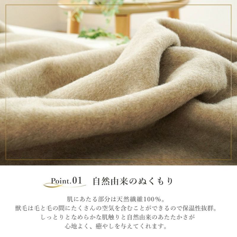 肌にあたる部分は天然繊維100%。 獣毛は毛と毛の間にたくさんの空気を含むことができるので保温性抜群。 しっとりとなめらかな肌触りと自然由来のあたたかさが心地よく、癒やしを与えてくれます。