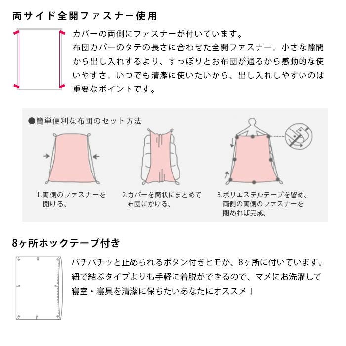 お肌に優しい綿100%の生地を使用しています。表面は肌触りもふんわり柔らか(裏面は無地の一般的な綿生地です)。綿の弱点である、縮みを抑える「防縮加工」付きで、じゃぶじゃぶ洗っても大丈夫♪更に寝汗による湿気で菌が繁殖しやすい布団カバーだからこそ嬉しい機能「抗菌加工」付きで清潔!