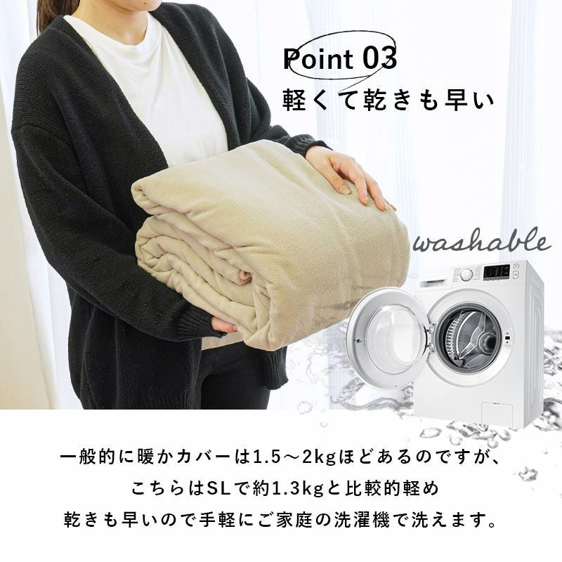 一般的に暖かカバーは1.5~2kgほどあるのですが、こちらはSLで約1.3kgと比較的軽め。乾きも早いので手軽にご家庭の洗濯機で洗えます。