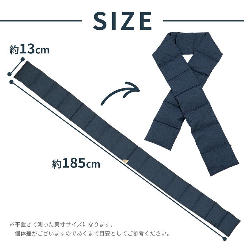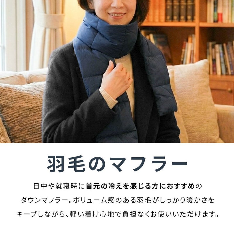 日中や就寝時に首元の冷えを感じる方におすすめのダウンマフラー。ボリューム感のある羽毛がしっかり暖かさをキープしながら、軽い着け心地で負担なくお使いいただけます。