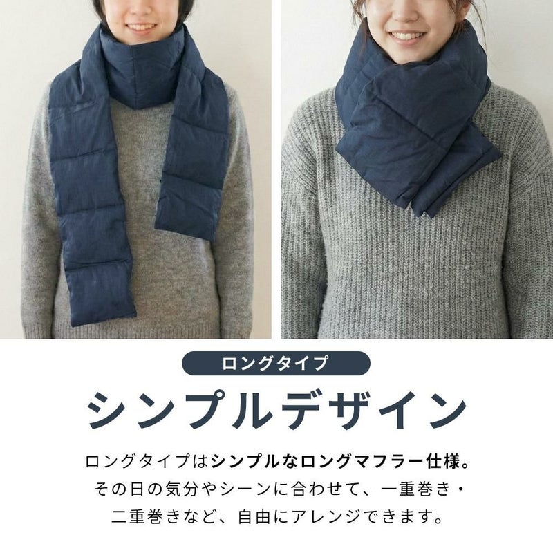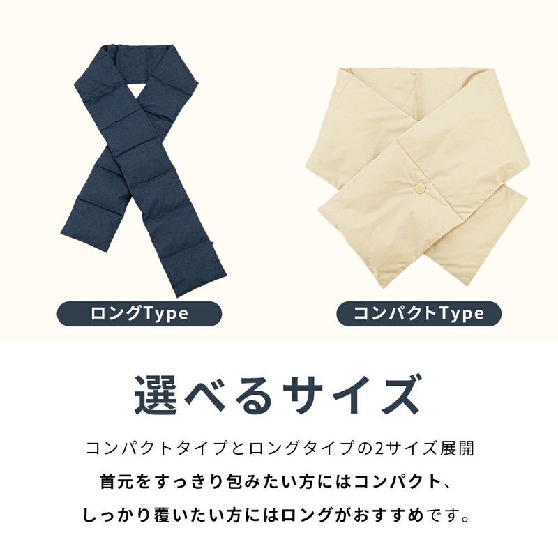 コンパクトタイプとロングタイプの2サイズ展開。首元をすっきり包みたい方にはコンパクト、しっかり覆いたい方にはロングがおすすめです。