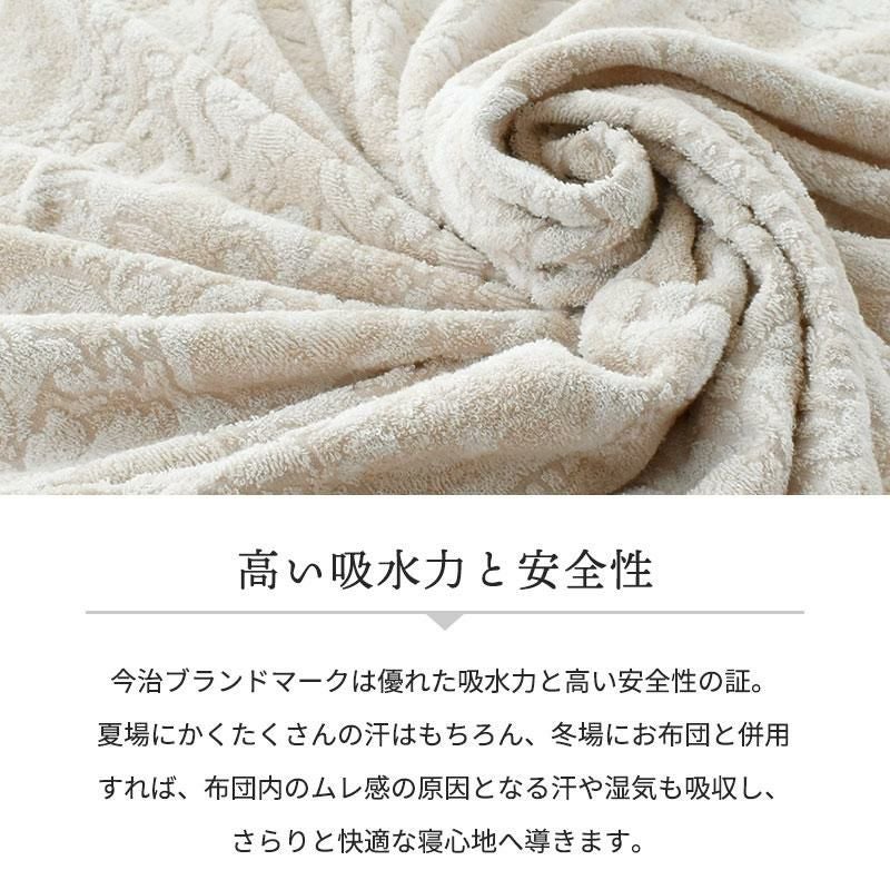今治ブランドマークは優れた吸水力と高い安全性の証。夏場にかくたくさんの汗はもちろん、冬場にお布団と併用すれば、布団内のムレ感の原因となる汗や湿気も吸収し、さらりと快適な寝心地へ導きます。