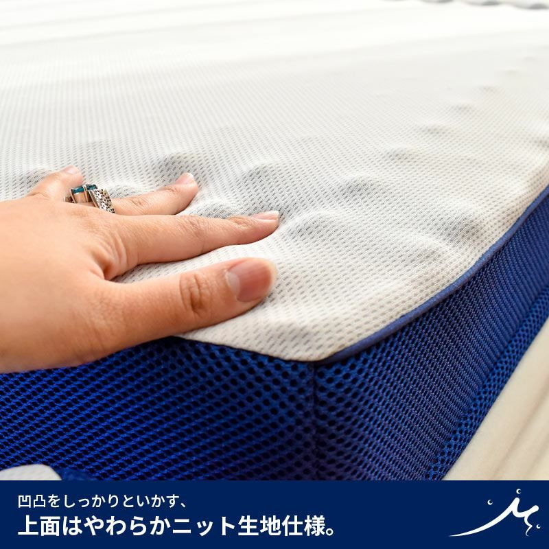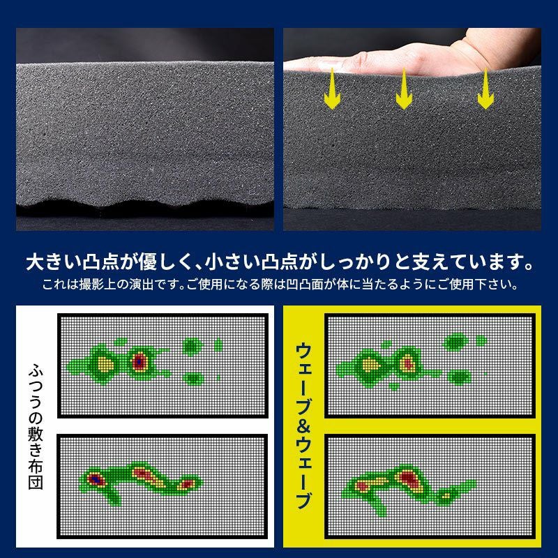 柔らかめの大きい凸点としっかり硬めの小さい凸点、2種類のウェーブで支える2段階構造。沈み込みポイントをしっかり支え、体重を分散することで理想の寝姿勢に。さらに、硬めの高反発ウレタンが寝返りをサポート!