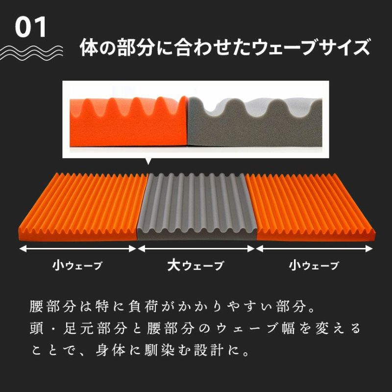 腰部分は特に負荷がかかりやすい部分。頭・足元部分と腰部分のウェーブ幅を変えることで、身体に馴染む設計に。腰部分はウェーブ幅が広いため、頭・足元部分より硬く感じられます。
