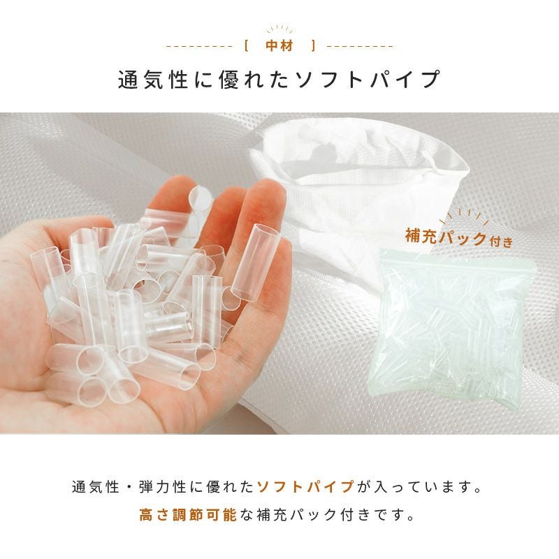 通気性・弾力性に優れたソフトパイプが入っています。 高さ調節可能な補充パック付きです。