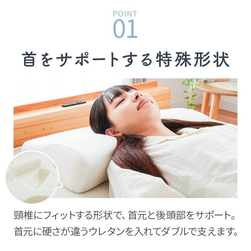 頸椎にフィットする形状で、首元と後頭部をサポート。首元に硬さが違うウレタンを入れてダブルで支えます。なお、首元の硬さが違うウレタンは底面から取り外しが可能です。