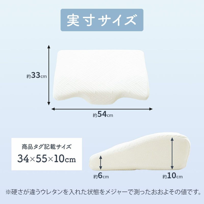 商品タグに記載されているサイズは「34×55×10cm」です。首元のウレタンを入れた状態をメジャーで測ったおおよその値は、約33×54cm、高さは肩側が約10cm、反対側の低い部分は約6cmですが、個体差により誤差がございます。