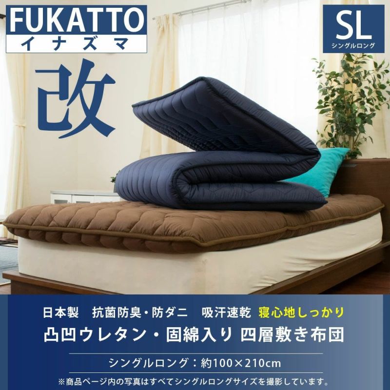 体圧分散敷き布団・凹凸ウレタン入りボリューム敷き布団「FUKATTO(ふかっと)」シリーズの固綿入り四層タイプ。スタイリッシュなイナズマキルトが特徴。ふかふか柔らかなのにしっかり支える!抗菌防臭・防ダニわたを使用しているので清潔。安心の日本製です。シンプルな無地、ブラウンとアイボリー、ネイビーの3色展開。