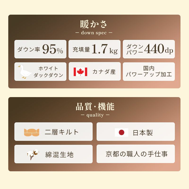他の画像を見る 在庫切れ 会員セール 当社限定 京都羽毛 銅 -akagane- プレミアムダックダウン95% 羽毛布団 クイーンロング 210×210cm ¥ 262,240 ¥ 130,000 税込 会員セール価格 ¥ 117,000 税込 お気に入りに登録する