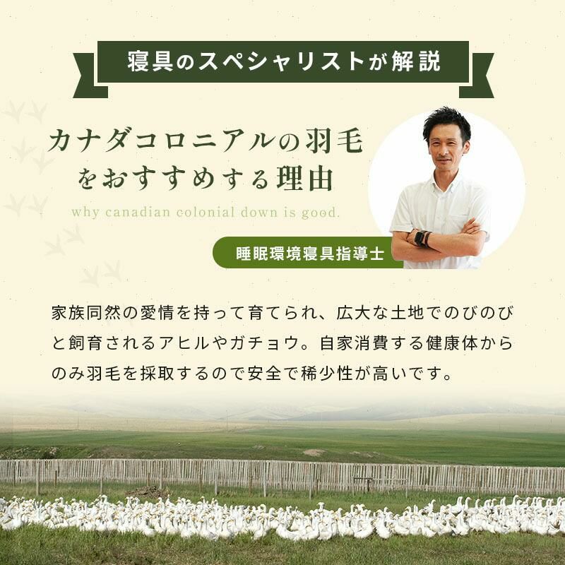 カナダに点在する農場(コロニー)で自然と共生しながら集団生活を続けている高潔で素朴なドイツ系移民「ハテライト・ピープル」によって限定供給される羽毛です。そこで暮らす人々は、宗教的教義のもと大自然とひとつになった昔ながらの自給自足の生活を続けています。広大な土地で のびのびと飼育されたガチョウから採取される羽毛は「ハテライト・ピープル」が日々の糧を得るために丁寧に飼育されるので、安全で非常に希少性の高いものになります。また年間の採取量が一定量を超えることなく高い信頼のおける正規ルートのみを使って国外へ出ることになります。