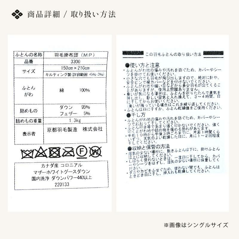 安心アフターサービス対応 京都羽毛 マザーグース ダウン95% 羽毛布団 ダブルロング 190×210cm 金