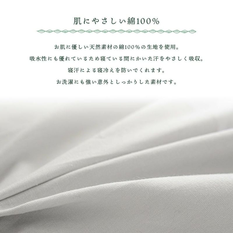 お肌に優しい天然素材の綿100%の生地を使用。吸水性にも優れているため寝ている間にかいた汗をやさしく吸収。寝汗による寝冷えを防いでくれます。お洗濯にも強い意外としっかりした素材です。