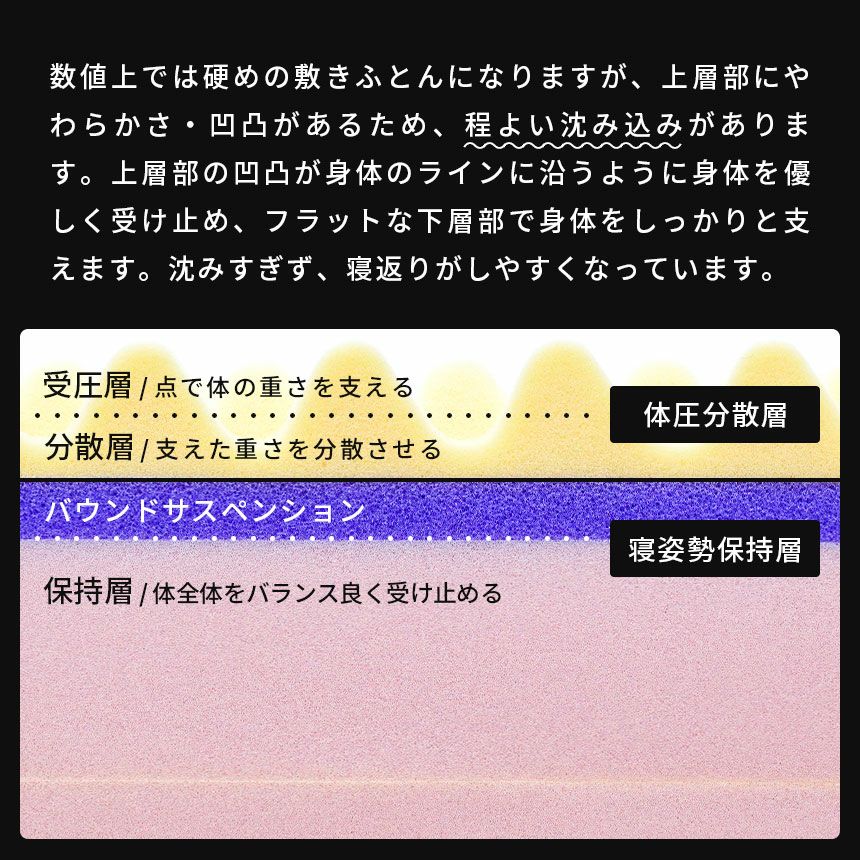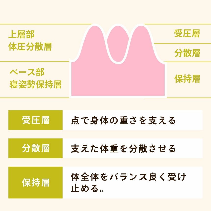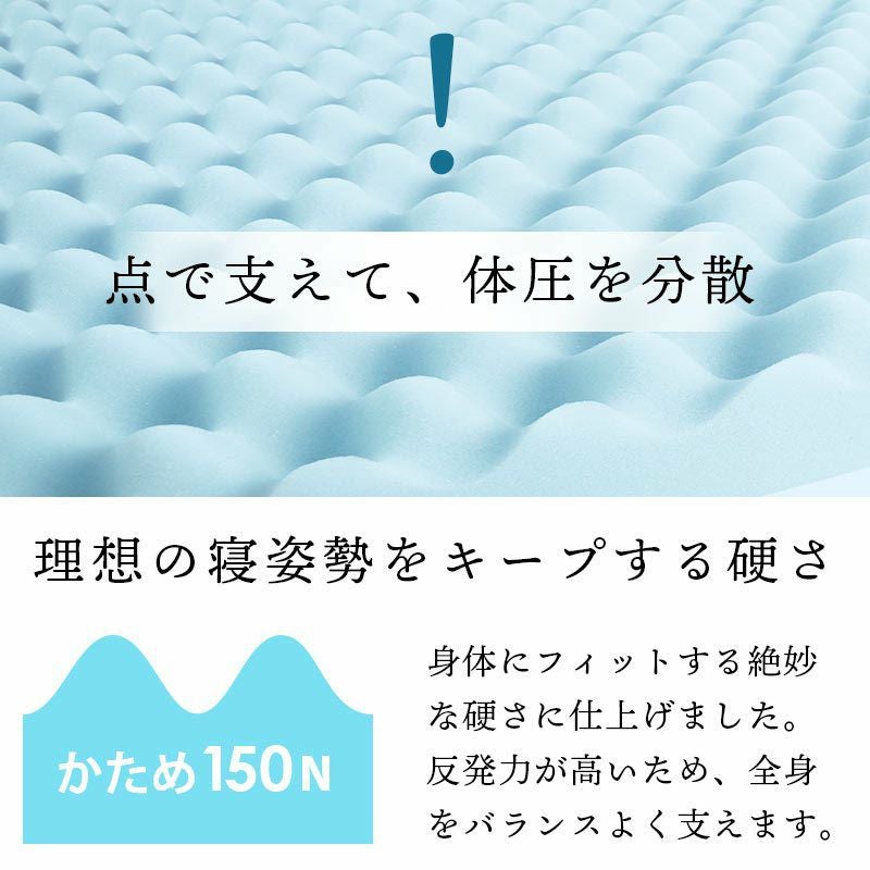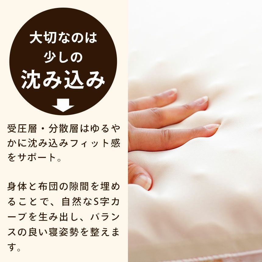 点で支えて体圧を分散、理想の寝姿勢をキープする硬さ。身体にフィットする絶妙な硬さに仕上げました。反発力が高いため、全身をバランス良く支えます。