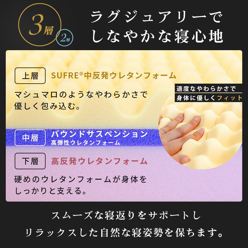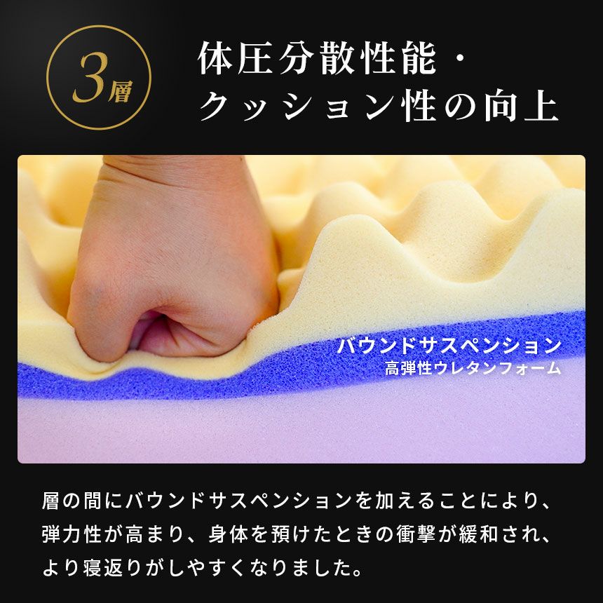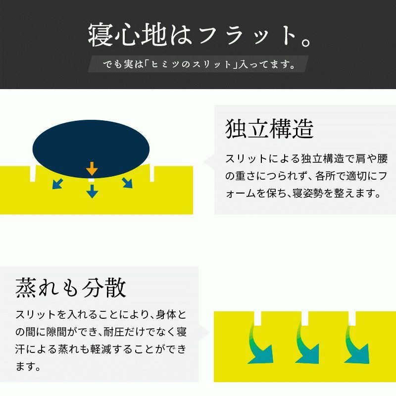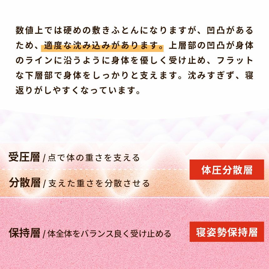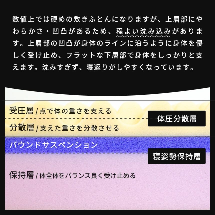 点で支えて体圧を分散、理想の寝姿勢をキープする硬さ。身体にフィットする絶妙な硬さに仕上げました。反発力が高いため、全身をバランス良く支えます。