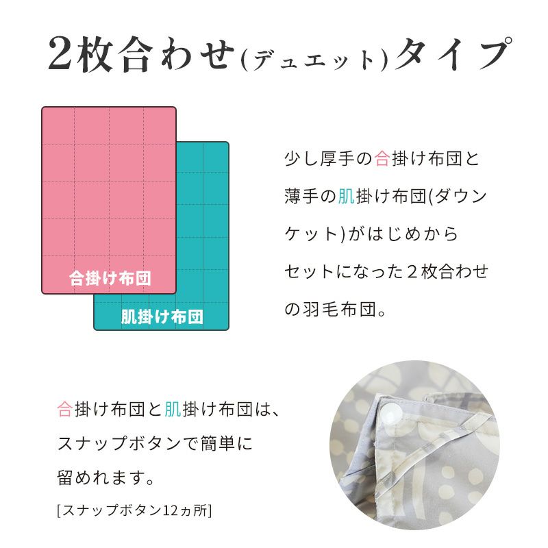 少し厚手の合掛け布団と薄手の肌掛け布団(ダウンケット)がセットになった2枚合わせタイプ。