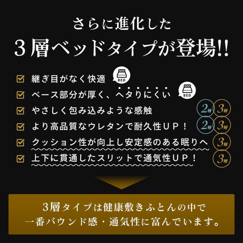 層のあいだにバウンドサスペンションを加えることにより、弾力性が高まり、身体を預けたときの衝撃が緩和され、より寝返りが打ちやすくなりました。さらに、上下に貫通したスリットを施すことによって湿気や汗を拡散させます。3層タイプは健康敷ふとんの中で一番バウンド感・通気性に富んでいます。
