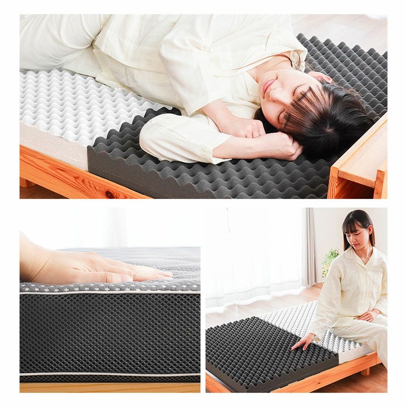床に直接敷いても底付き感がなく、しっかりとしたクッション性のある寝心地です。 【ローテーション可能】中材のウレタンは取り外せるので、入れ替えることができます。 【血流を妨げない凹み】点は面よりも身体を圧迫する面積が少なく、血流に負荷を与えません。