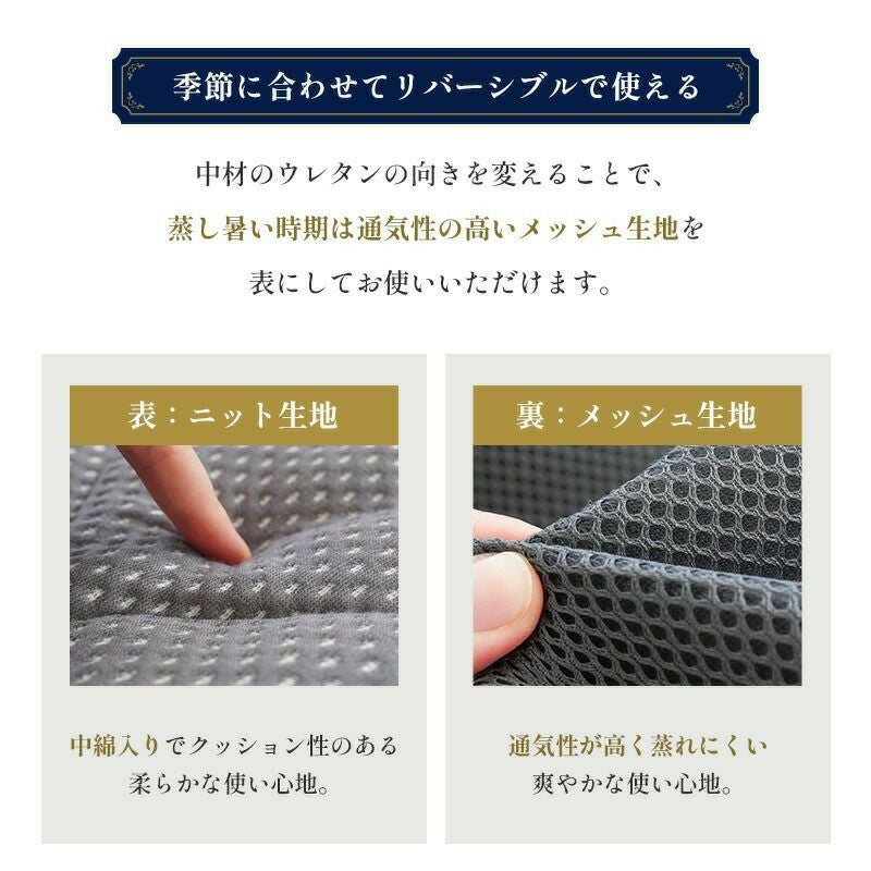 表面は中綿入りニット生地のため、柔らかな触り心地でプロファイルウレタンの凸凹感を軽減します。裏面、側面には通気性の良いメッシュ生地を使用しています。 【季節に合わせてリバーシブルで使える】中材のウレタンの向きを変えることで、蒸し暑い時期は通気性の高いメッシュ生地を表にしてお使いいただけます。 【静電気軽減ニットだから安心】ニット素材といえば静電気が気になりがち…。ポリエステルにレーヨンを混ぜ合わせることで静電気の発生を大幅に抑制しました。