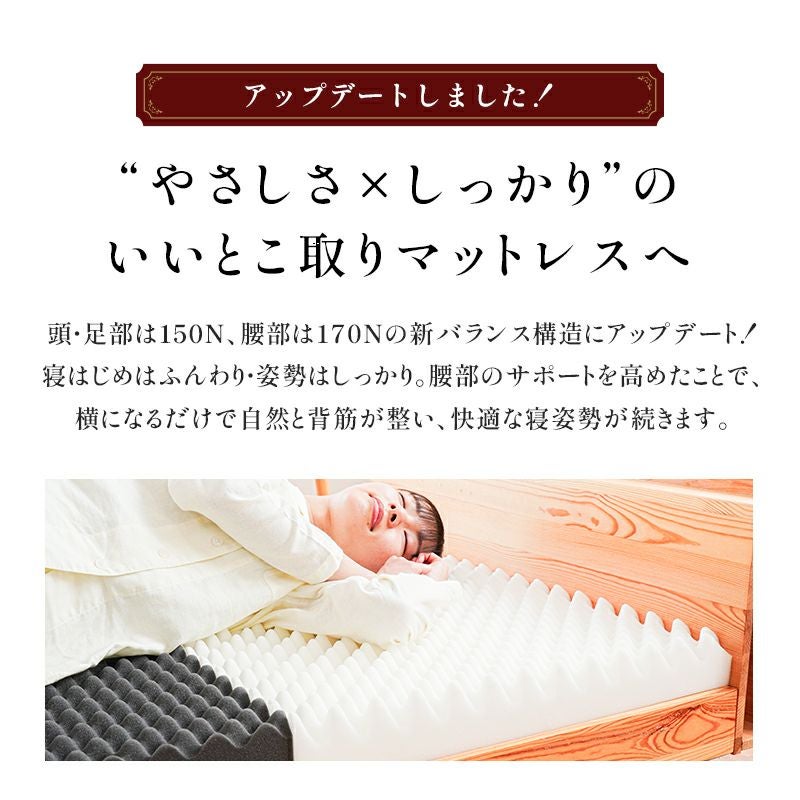 レギュラーモデルは腰部分がやや硬め(170ニュートン)で、ハードモデルは腰部分がしっかり硬め(240ニュートン)の仕様となっております。スタンダードな寝心地をお求めの方には「レギュラーモデル」を、しっかり硬めのマットレスがお好みの方には「ハードモデル」をおすすめ致します。
