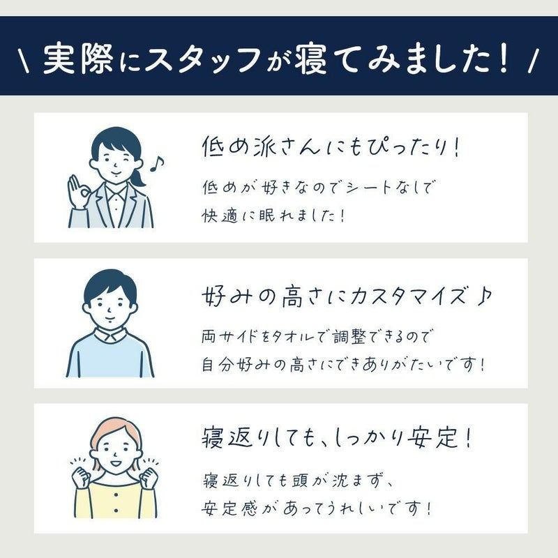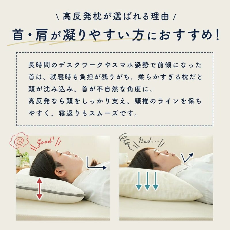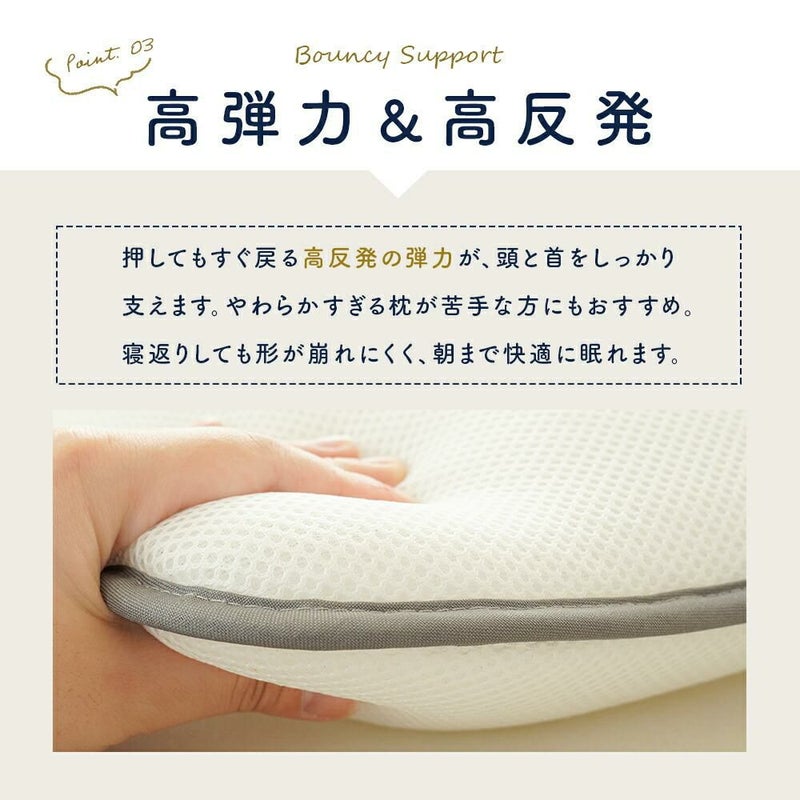 押してもすぐ戻る高反発の弾力が、頭と首をしっかり支えます。やわらかすぎる枕が苦手な方にもおすすめ。寝返りしても形が崩れにくく、朝まで快適に眠れます。