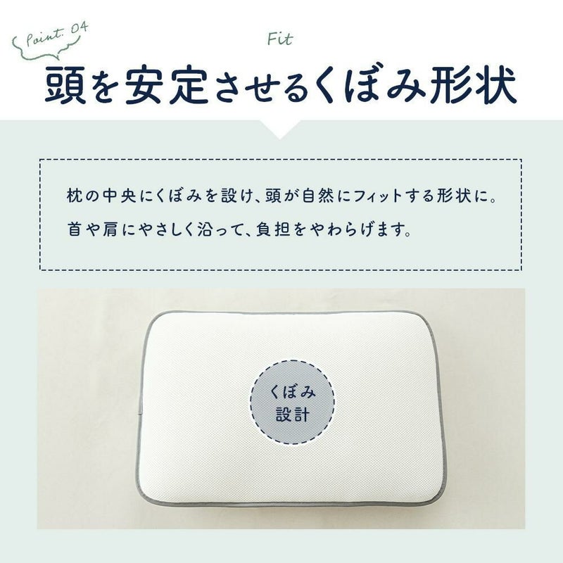 枕の中央にくぼみを設け、頭が自然にフィットする形状に。首や肩にやさしく沿って、負担をやわらげます。