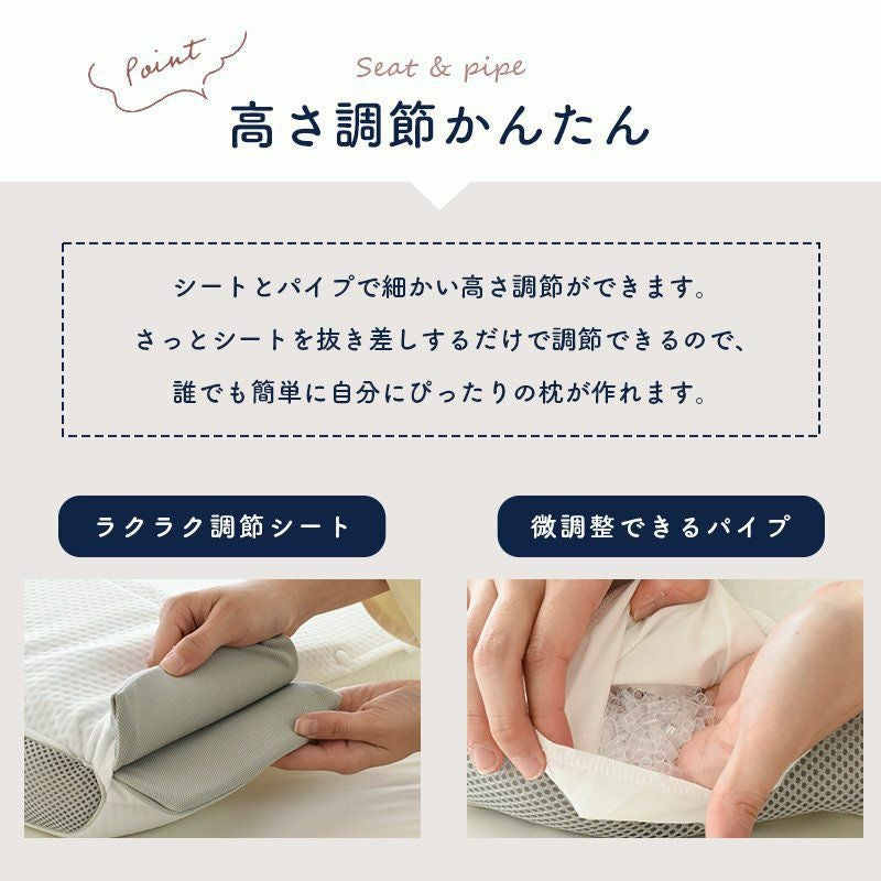 シートとパイプで細かい高さ調節ができます。さっとシートを抜き差しするだけで調整できるので、誰でも簡単に自分にぴったりの枕が作れます。パイプの調節口は首筋部・後頭部の2箇所あります。