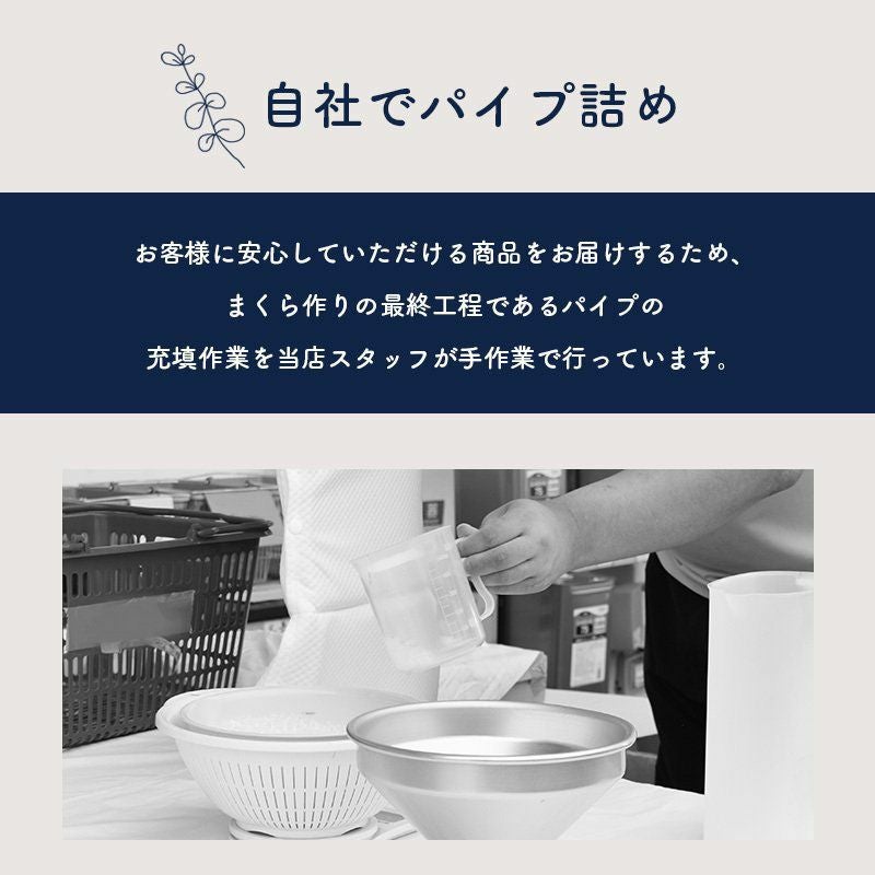 お客様に安心していただける商品をお届けするため、まくら作りの最終工程であるパイプの充填作業を当店スタッフが手作業で行っています。