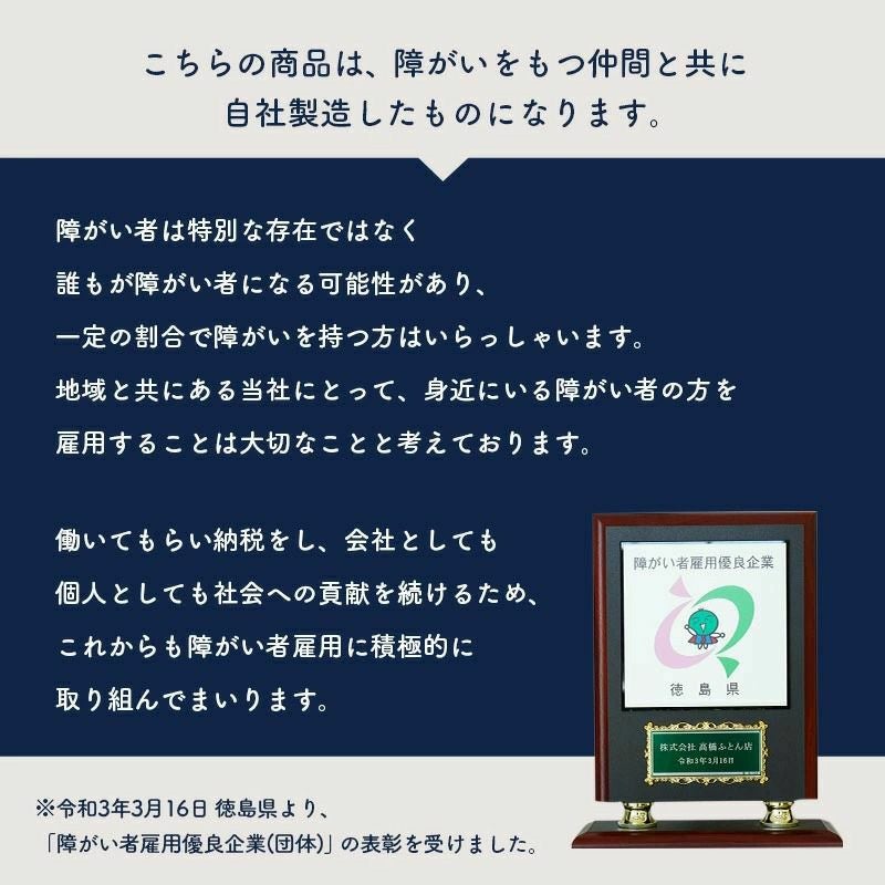 こちらの商品は障がいを持つ仲間と共に自社製造したものになります。障がい者は特別な存在ではなく、誰もが障がい者になる可能性があり、一定の割合で障がいを持つ方はいらっしゃいます。地域と共にある当社にとって、身近にいる障がい者の方を雇用することは大切なことと考えております。働いてもらい納税をし、会社としても個人としても社会への貢献を続けるため、これからも障がい者雇用に積極的に取り組んでまいります。※令和3年3月16日 徳島県より「障がい者雇用優良企業(団体)」の表彰を受けました。